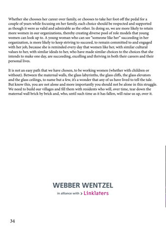 Whether she chooses her career over family, or chooses to take her foot off the pedal for a couple of years while focusing on her family, each choice should be respected and supported as though it were as valid and admirable as the other. In doing so, we are more likely to retain more women in our organizations, thereby creating diverse pool of role models that young women can look up to. A young woman who can see “someone like her� succeeding in her organization, is more likely to keep striving to succeed, to remain committed to and engaged with her job, because she is reminded every day that women like her, with similar cultural values to her, with similar ideals to her, who have made similar choices to the choices that she intends to make one day, are succeeding, excelling and thriving in both their careers and their personal lives. It is not an easy path that we have chosen, to be working women (whether with children or without). Between the maternal walls, the glass labyrinths, the glass cliffs, the glass elevators and the glass ceilings, to name but a few, it’s a wonder that any of us have lived to tell the tale. But know this, you are not alone and more importantly you should not be alone in this struggle. We need to build our villages and fill them with residents who will, over time, tear down the maternal wall brick by brick and, who, until such time as it has fallen, will raise us up, over it.