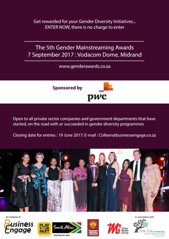 Open to all private sector companies and government departments that have started, on the road with or succeeded in gender diversity programmes Closing date for entries : 19 June 2017; E-mail : Colleen@businessengage.co.za