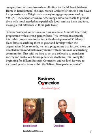 company to contribute towards a collection for the Mohau Children’s Home in Randfontein,” she says. Mohau Children’s Home is a safe haven for approximately 230 girls across varying age groups managed by YWCA. “The response was overwhelming and we were able to provide them with much needed non-perishable food, sanitary items and toys, making a real difference in these girls’ lives.” Telkom Business Connexion also runs an annual 8-month internship programme with a strong gender focus. “We invested in a specific internship programme to fast track the development of 50 talented black females, enabling them to grow and develop within the organisation. More recently, we ran a programme that focused more on disabled interns and that’s really in line with our mission of enriching communities. That said, we have to act as a collective to transform society and enable our future generations to thrive, this is only the beginning for Telkom Business Connexion and we look forward to increased gender focus within the Telkom Group of companies.”