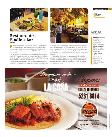 ara quienes visitan la ciudad de Mérida o viven en ella, los restaurantes Eladio’s Bar son la mejor opción para divertirse y disfrutar de la variedad de platillos y botanas típicos de Yucatán, en un ambiente 100 % familiar con música en vivo. Con seis restaurantes en la ciudad de Mérida y uno en la playa de Progreso, sin duda es la mejor elección para disfrutar en pequeñas porciones de la comida regional yucateca y del mar, en sus cómodas instalaciones. Es un auténtico botanero, una característica que los distingue, en donde además se pueden disfrutar de creaciones
