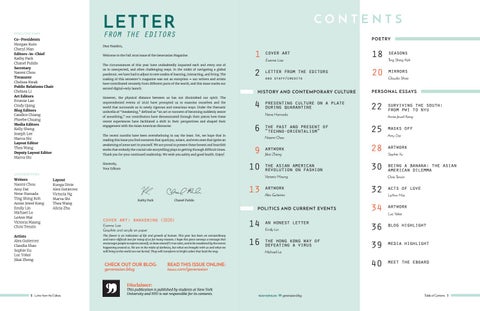 cover art: awakening (2020) Evonne Lao Graphite and acrylic on paper The flower is an indication of life and growth of human. This year has been an extraordinary and extra-difficult one for many of us for many reasons. I hope this piece conveys a message that encourages people to express oneself, to show oneself’s true color, and to be awakened by the events happening around us. We are in the midst of darkness, but what we brought with us and what we will bring to the world are not buried. They will transform to bright colors that lead the way.