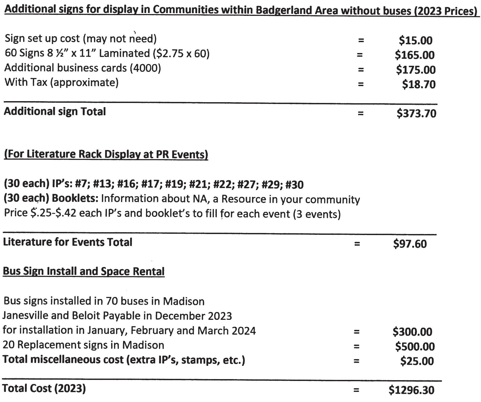3. Store signs: In the last year we gave around 60 8” by 11” inch laminated store signs to various addicts in the Area to put up in stores, libraries, cop shoppes, hospital emergency rooms. We ran out of signs already so we will probably ask the Area to purchase 60 more for next year. This also be in PR 2023 budget.