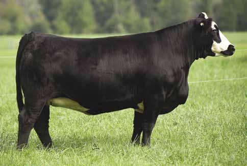 A moderate belly draggin beast, X11 was a model cow. As a cow/calf pair she was 4th overall at the Jr Nationals. That calf then sold for $7,500 in Louisville. Her progeny have sold consistently from $5,000-$14,000. X11’s udder was unbelievable and her progeny all followed. You can’t put much more middle in a cow. Looks like an Angus but her papers say otherwise.