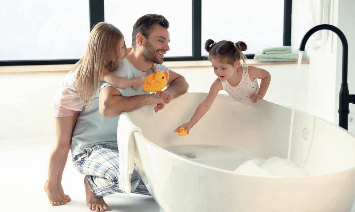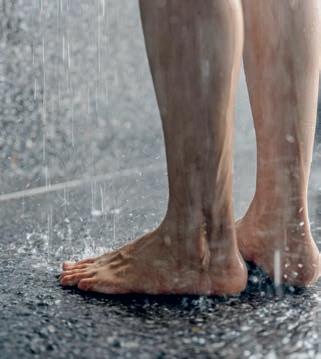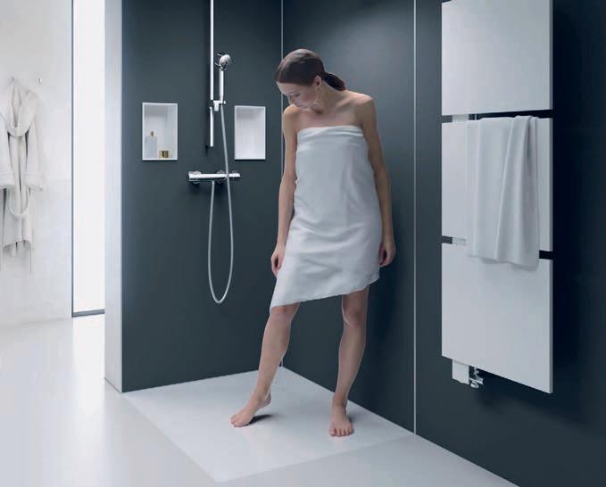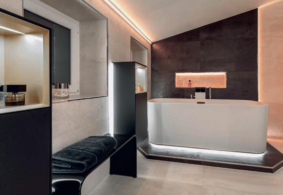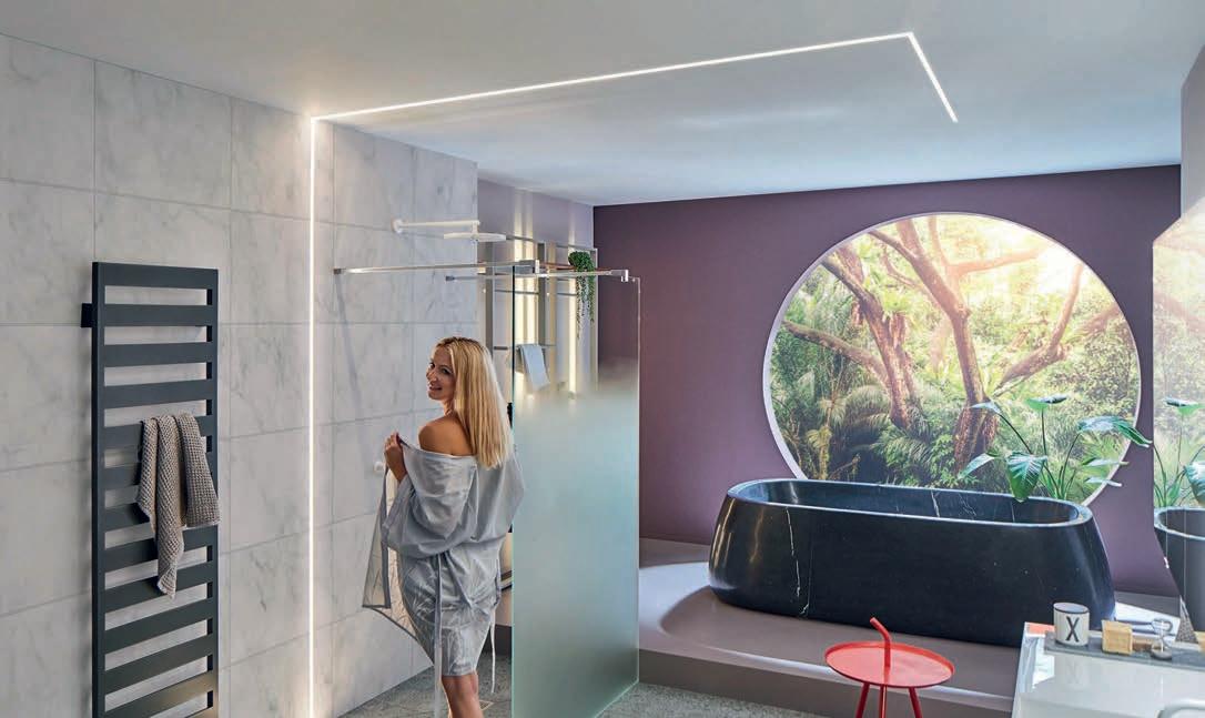 Von einer eleganten Lichtleiste in der Wand über eine beleuch tete Wandecke bis zu einem von Licht eingerahmten Spiegel und illu minierten Treppenstufen – den Gestal tungsmöglichkeiten mit LED-Modulen sind kaum Grenzen gesetzt. Auch Sockelleisten oder Wand scheiben lassen sich damit individuell betonen. Die LEDModule Liprotec-Easy von Schlüter-Systems beispielsweise kann man ohne großen Aufwand im Zuge der Fliesenverle gung installieren. Sie bestehen aus hochwertigen Aufnahme profilen aus Aluminium oder Edelstahl sowie einem flexiblen LED-Schlauch. Auch im Duschbereich sorgen die Module für
