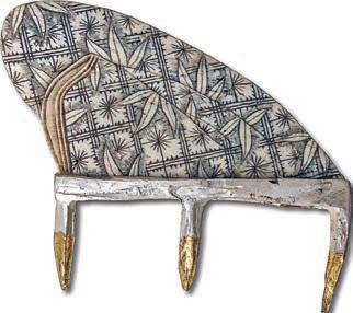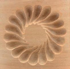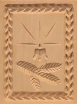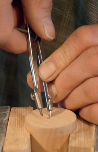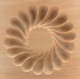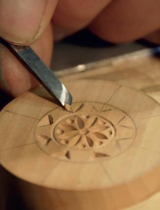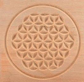 Geißfuß filigran ausgestochen. Ein Probeabdruck in Knetmasse bestätigt schließlich alle herausgearbeiteten Feinheiten eines Springerle-Models. „Renner auf den Märkten sind meine ohne Vorzeichnung frei aus Holz geschaffenen, förmlich einem Steinpilz ähnelnden Nudelstempel“, stellt Leonhard Angele fest. Im Schraubstock wird der mit Sorgfalt gedrechselte „Pilz-Rohling“ eingespannt, um dann mit scharfen, Rasiermessern gleichenden Bildhauerfeilen, Hohleisen und Stechbeiteln das Muster in die flache Stempelfläche in Feinarbeit hineinzuschnitzen, nicht ohne zwischendurch den Nudelstempel mit Knete auf Symmetrie und Tiefe zu prüfen und mittels einer Punze die Oberfläche zu glätten. „Dann kann jeder auf ausgerollten, etwa zwei Millimeter dicken Nudelteigplatten unter Verwendung der Stempel die plastisch hervortretenden Motive aufdrücken, sie danach ausstechen und anschließend gleich kochen und verzehren oder für spätere Verwendungen trocknen“, lautet sein Rezept, das er von italienischen Hotelköchen übernahm. „Vorbild dafür sind die Klöster, die schon vor langen Zeiten mit religiösen Darstellungen versehene Oblatenstempel besaßen und damit Hostien prägten“, weiß Leonhard zu berichten. Ein häufig gewünschtes Motiv für einen Stempel aus seiner Werkstatt ist die uralte, heute wieder öfter an Türstöcken als Schutzzeichen zu findende „Blume des Lebens“. Erste Nudelstempel entdeckte der Holzschnitzer übrigens im Urlaub an der Ligurischen Küste in einem Restaurant als „Vorspeise“. Im Dorf Varese de Ligure gehört es bis heute zur Tradition, dass zu