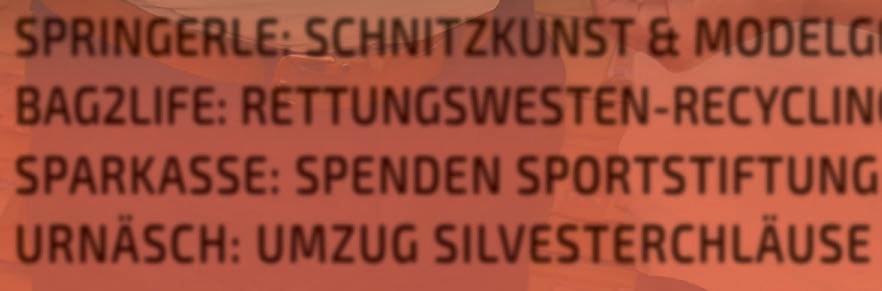 Ausgabe 2-2022 Hergestellt mit Unterstützung der Sparkasse Pforzheim Calw und dem KreisSeniorenRat Pforzheim – Enzkreis e.V. Generationen im Dialog www.generationen-im-dialog.de SPRINGERLE: SCHNITZKUNST & MODELGEBÄCK BAG2LIFE: RETTUNGSWESTEN-RECYCLING SPARKASSE: SPENDEN SPORTSTIFTUNG URNÄSCH: UMZUG SILVESTERCHLÄUSE