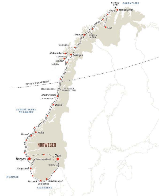 Die Nordkap-Linie führt zunächst in den hohen Norden zum Nordkap, dann geht es zum südlichsten Punkt des Landes und in die Hauptstadt Oslo.