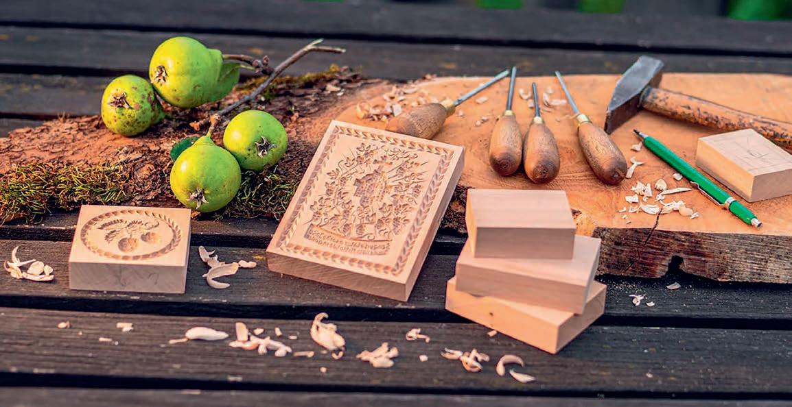 und Werkstatt. Er produziert schon sehr lange aus geschmeidigem Birnbaum-, Apfel- oder auch Zwetschgenholz – natürlich von der eigenen Streuobstwiese – unter Verwendung fein geschliffener Werkzeuge Gebäckmodeln für typische „Springerle“. Seit zwei Jahren zudem Nudelstempel, beide so „wie sie auch von Hausfrauen, Bäckern und Köchen gern verwendet werden oder einfach als Mitbringsel Freude bereiten.“ Das notwendige Holz liefert dem Handwerker der eigene Wald in Hülle und Fülle.
