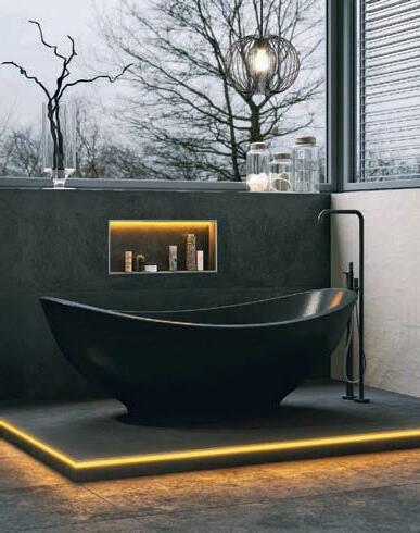 Akzente, denn dank der Schutzklasse IP 67 sind sie für den Einsatz in Feuchträumen geeignet. Mehr Informationen für Bauherren und Planer gibt es unter www.schlueter.de. Mit Komplettsets, die alle notwendigen Komponenten enthalten, werden im Badezimmer beleuchtete Wandnischen in verschiedenen Abmessungen zum Eyecatcher.