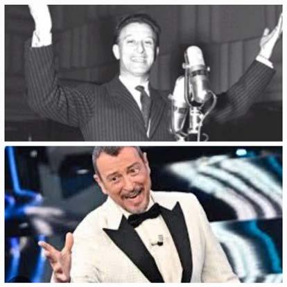 In alto Nunzio Filogamo, presentatore della prima edizione del Festival di Sanremo (29 gennaio 1951); sotto Amadeus (6 febbraio 2024) alla conduzione della 74a edizione