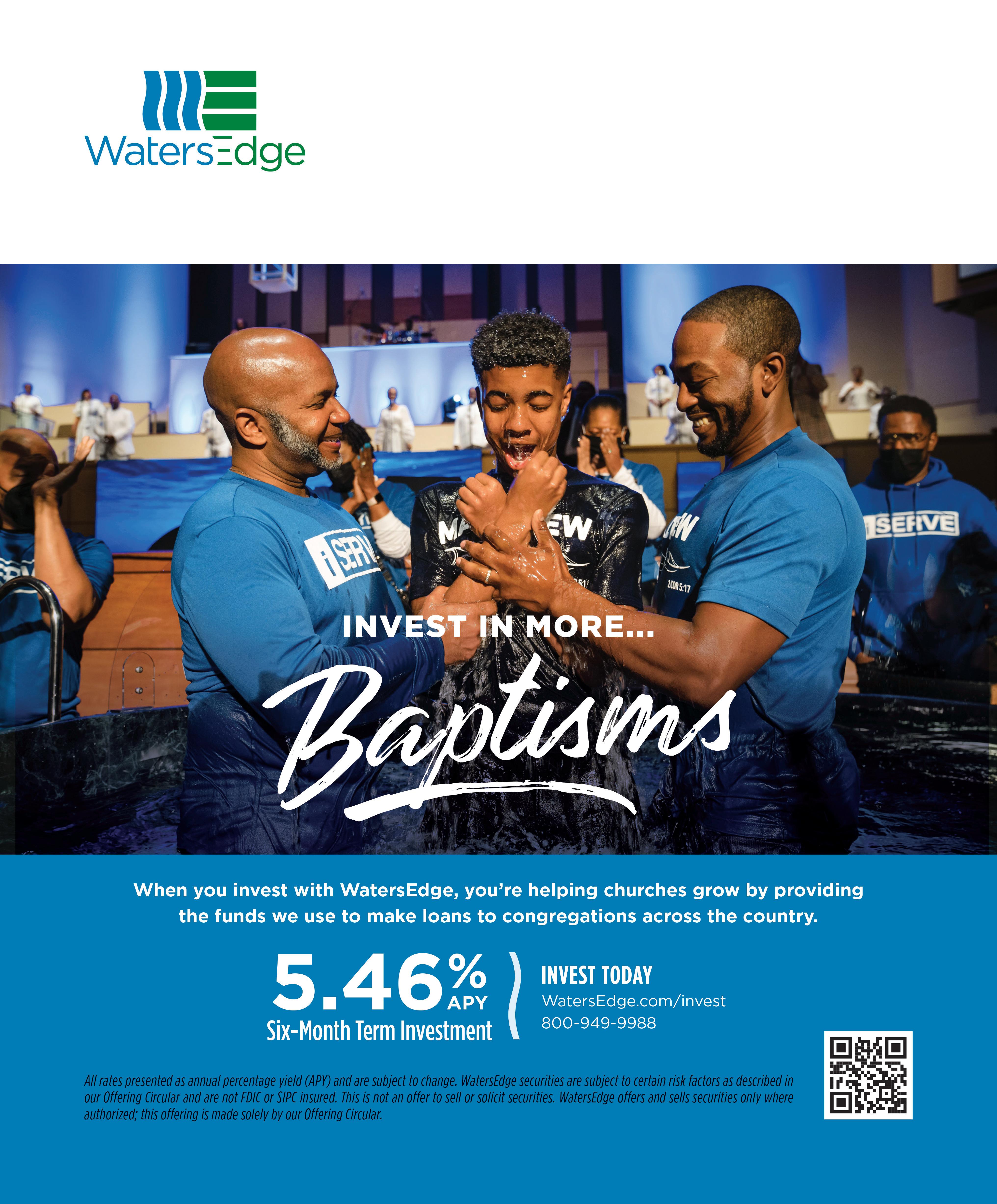 When you invest your funds with WatersEdge Kingdom Investments, you’re not just getting a great rate. You’re providing Gospel-centered loans to churches all over the country so they can continue to change lives with the Good News of Jesus Christ. invest@WatersEdge.com | 800-949-9988 | WatersEdge.com/invest