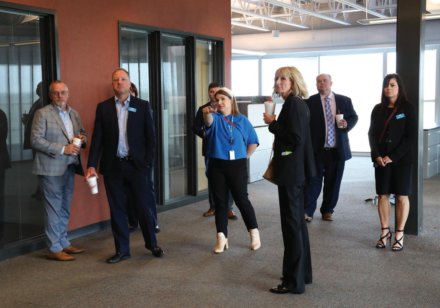 Opposite page: ENCOURAGING WORDS –WatersEdge Board Chair Scott Craddick shares some thoughts during the Sonic Building dedication ceremony April 19 in Bricktown. This page, top: A NEW LOOK – WatersEdge COO Kristen Karr, in blue, leads board members on a tour of the Sonic Building. This page, bottom: HOME SWEET HOME – The south side of the Sonic Building overlooks the Bricktown Canal.