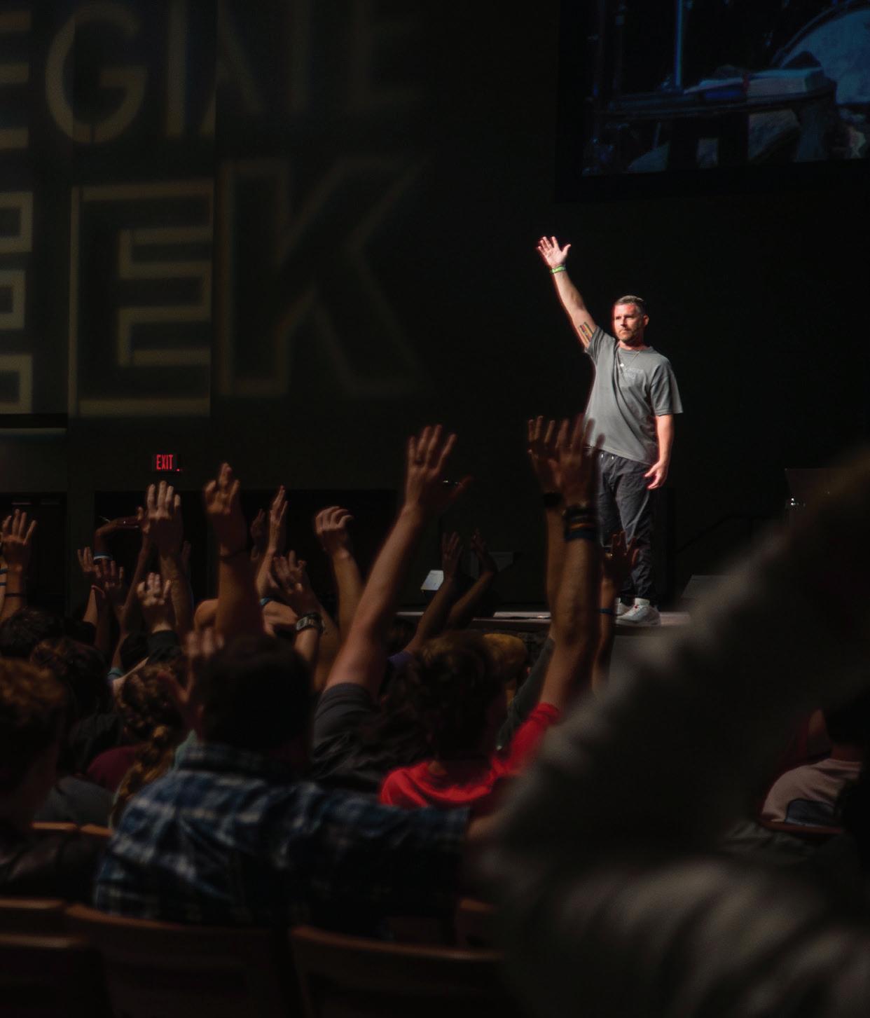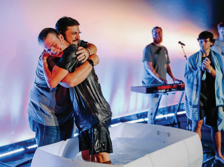 Opposite page: A SEASON OF RENEWAL – David Palmer began as Covenant’s head pastor at the end of 2022. He has led the church through a season of growth, fundraising, and change over the past two years. This page, top: BAPTISM WITH A SIDE OF POPCORN – With Sunday services held in a rented AMC movie theater, the best place for baptisms at Covenant Church is in a makeshift baptistery onstage in front of the movie screen. This page, bottom: DISCIPLESHIP CIRCLES – Covenant Church’s small group ministry has expanded from 285 to more than 400 weekly participants, fueling the growth of the church.
