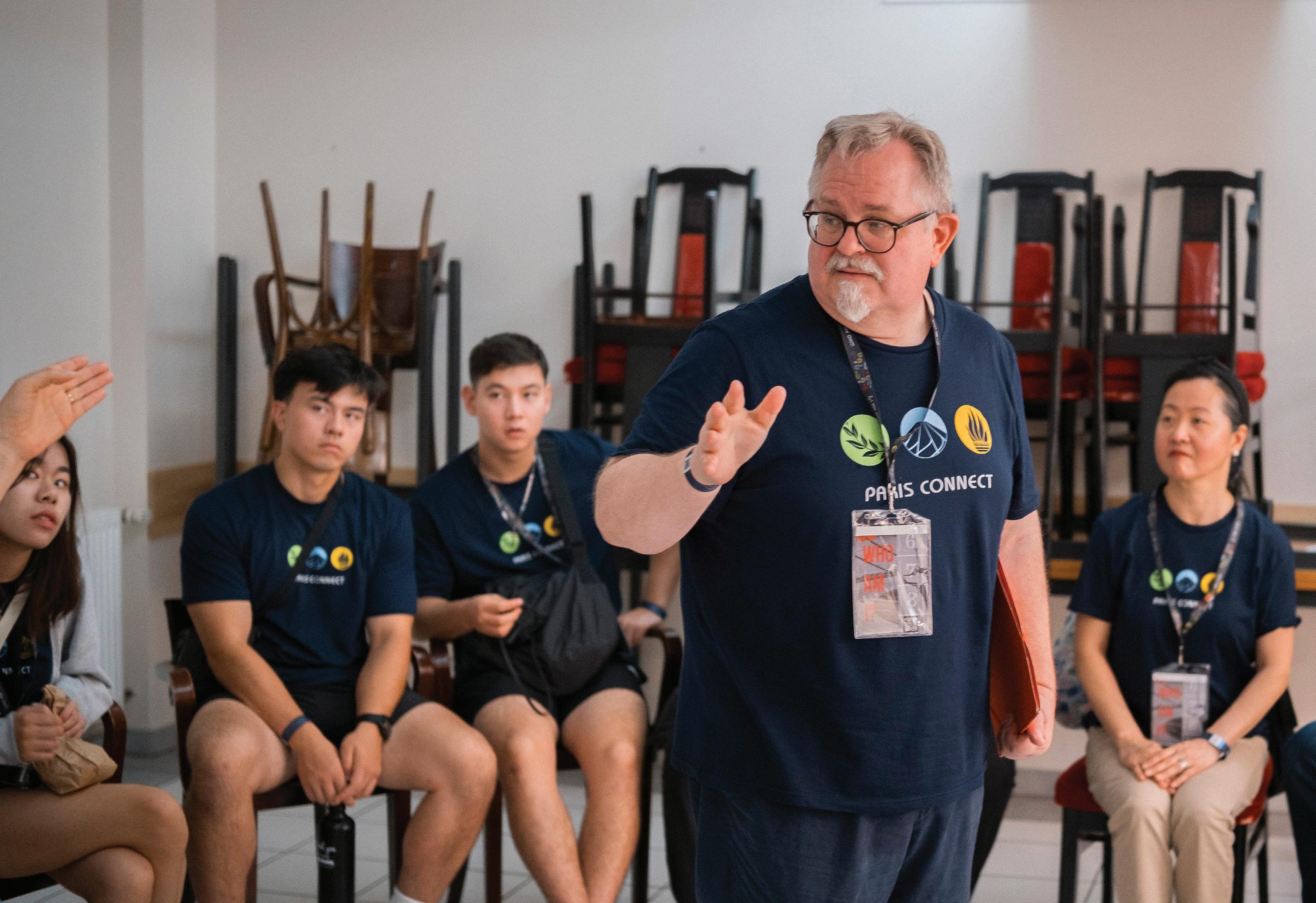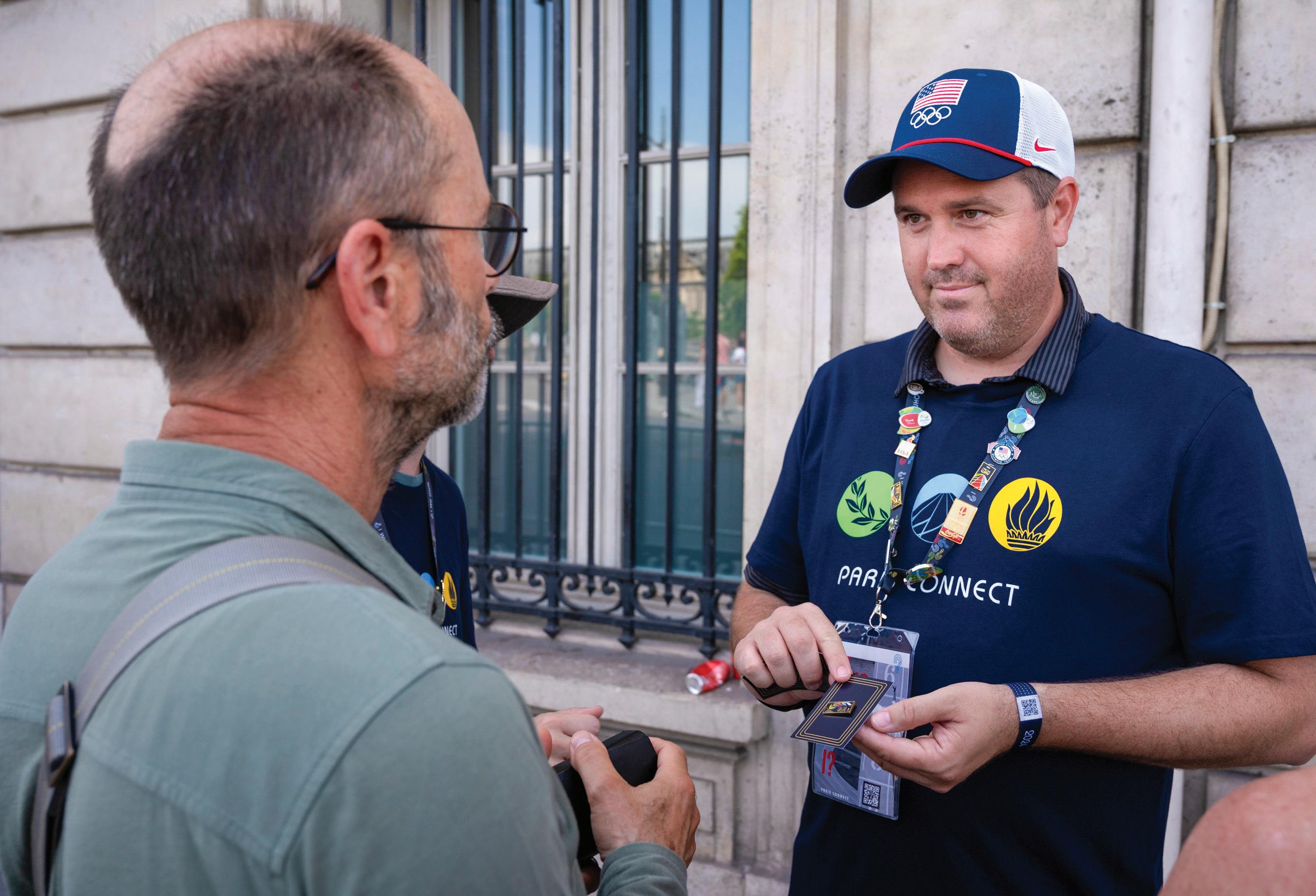 Top : PINNING HOPE IN PARIS – Keith Slagle, volunteer from Johnson Ferry Baptist Church in Marietta, GA., shares the Gospel using a Christian Olympic pin in the streets of Paris. Bottom : TRAINING FOR THE TASK – Hundreds of volunteers from the US traveled to Paris for the 2024 Olympics to reach the lost.