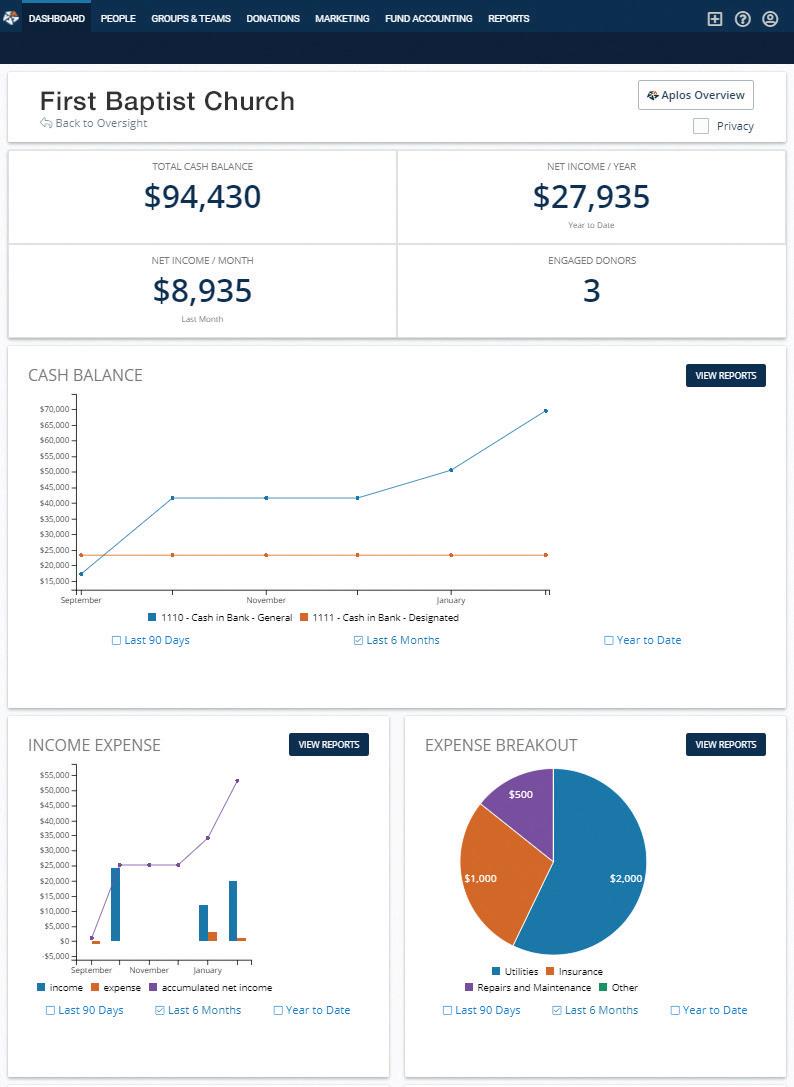 Access your church’s financial information from anywhere. Interactive dashboards show real-time information including cash balances, income and expenses, and contribution trending. Powerful reporting tools analyze current and historical data, putting critical information about your church’s financial health at your fingertips.