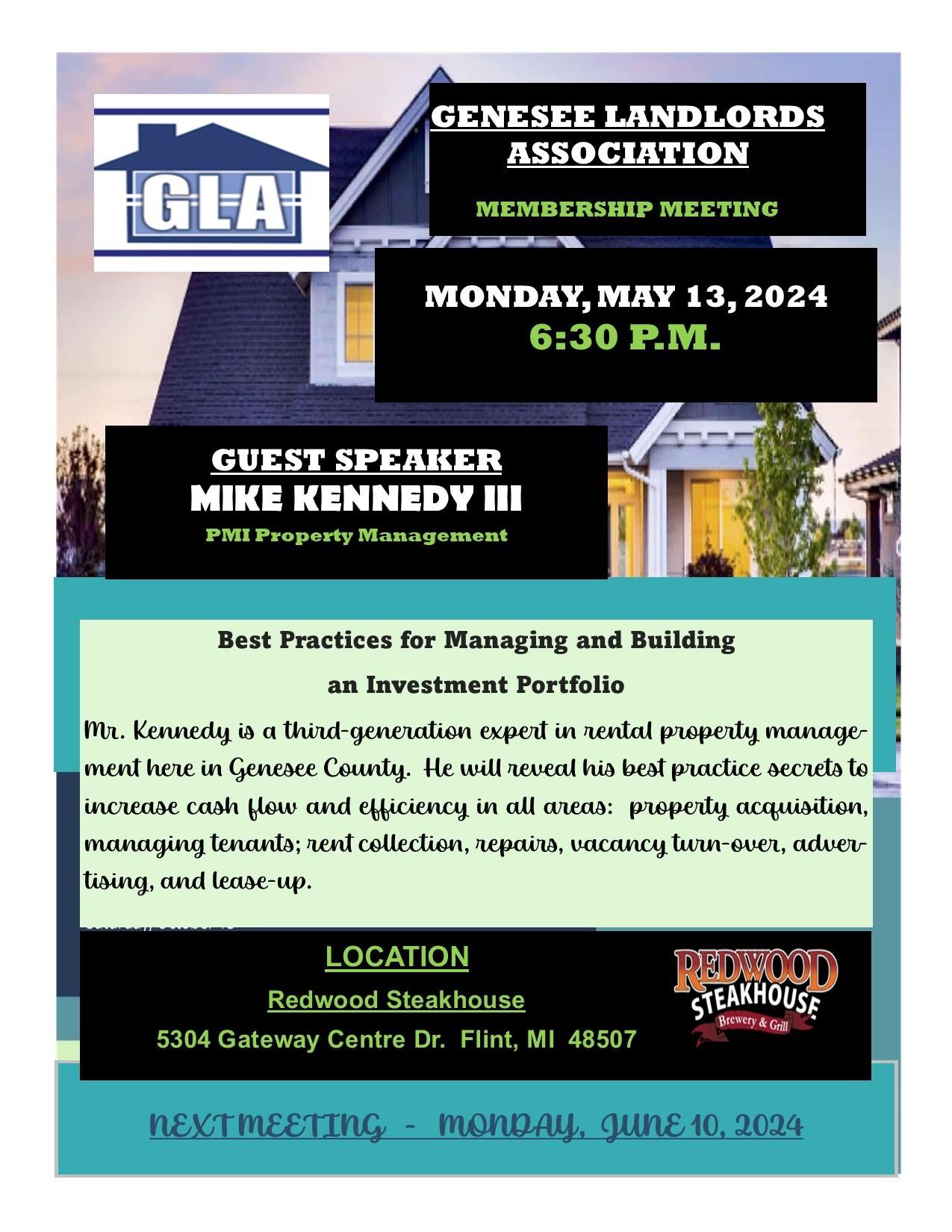 To become a member of GLA mail your name, address, phone number and check payable to GLA G4428 Fenton Rd, Flint, MI 48507 OR on the web at glaoffice@geneseelandlords.org
