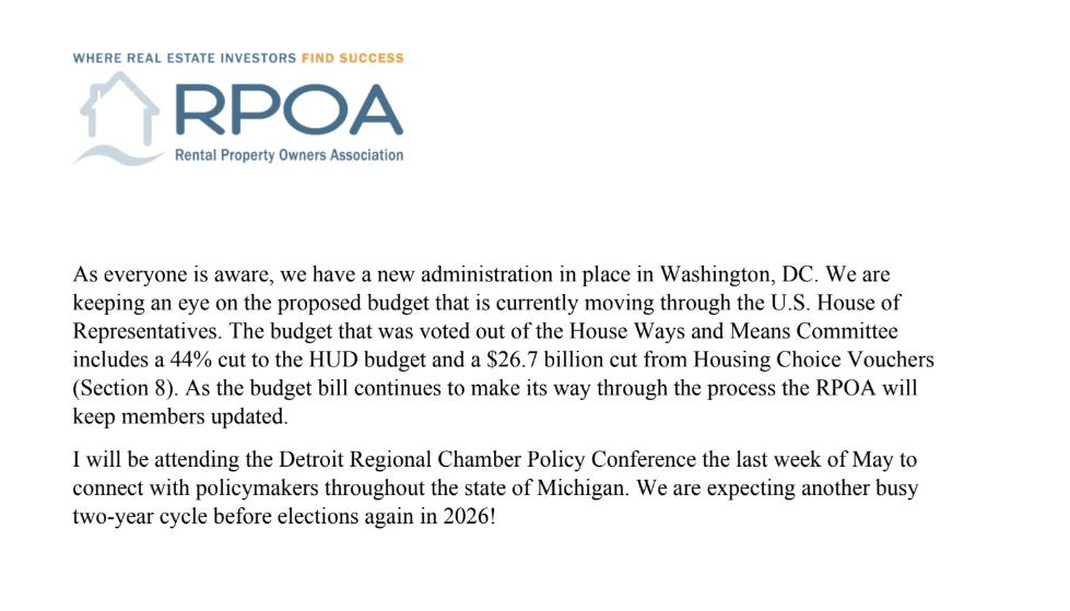 We will notify members of important happenings and dates through email; be sure to keep current on information by providing the Genesee Landlord Office at (810) 767-3080 or email us at glaoffice@geneseelandlords.org
