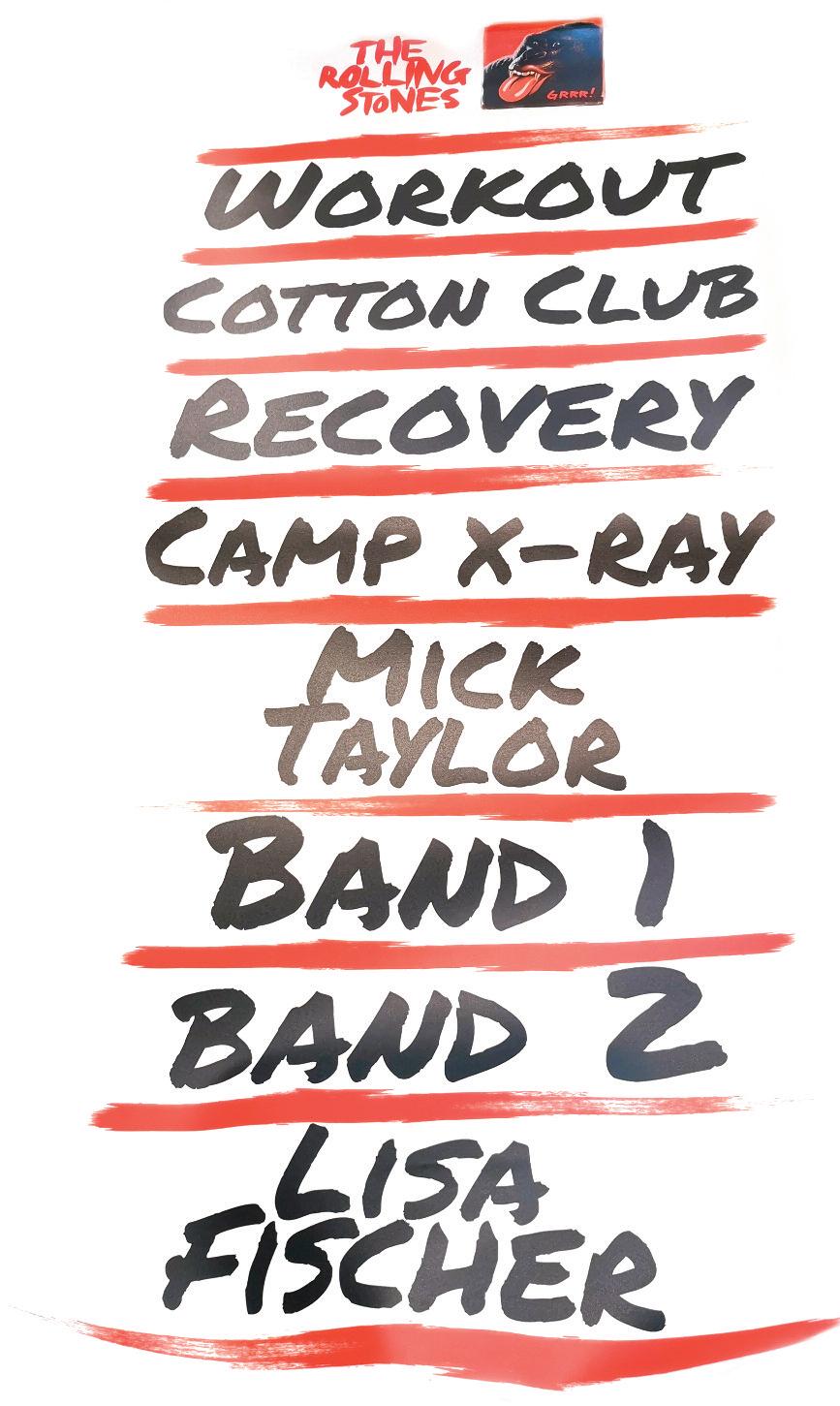 O ur dressing rooms have the same names wherever we play Mine is always called ‘Recovery’, Keith’s is ‘Camp X-Ray’, Charlie’s is ‘Cotton Club’ and Mick’s is ‘Work O ut’
