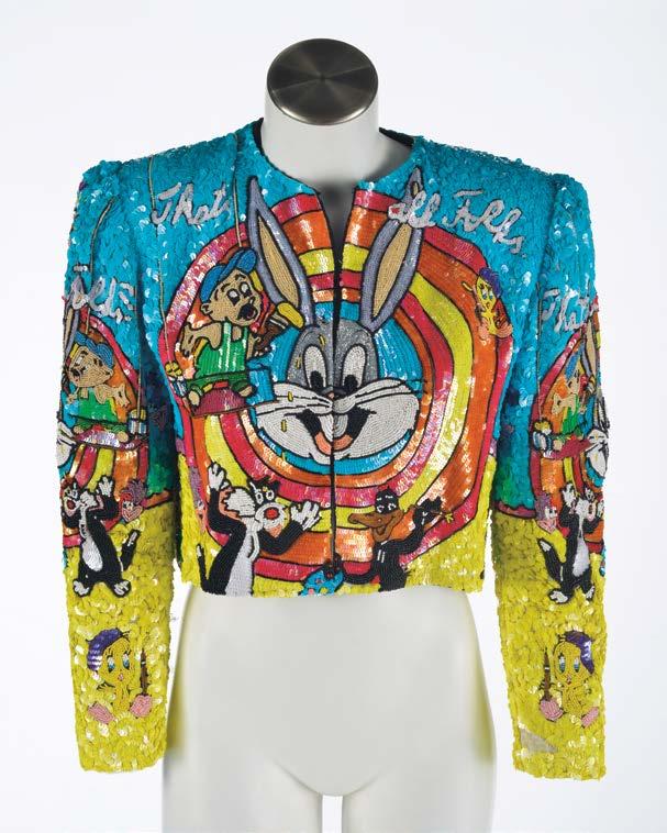 Veste courte, soie, entièrement brodée de sequins et perlettes illustrant des personnages de Looney Tunes, taille L 150/200