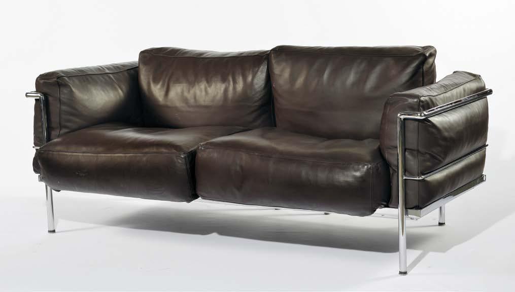 1007. Paire de canapés dans le style de Le Corbusier Cuir chocolat et acier chromé, 59 x 172 x 71 cm 800/1200