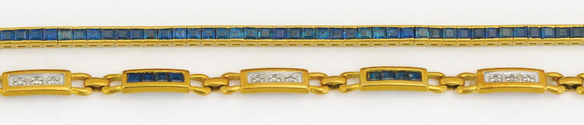 Cadran beige, chiffres romains et minuterie en chemin de fer noirs, aiguilles en acier bleui, remontoir cabochon saphir, bracelet à boucle déployante, or et acier, 22 x 22 mm, poids brut 44 g 800/1200