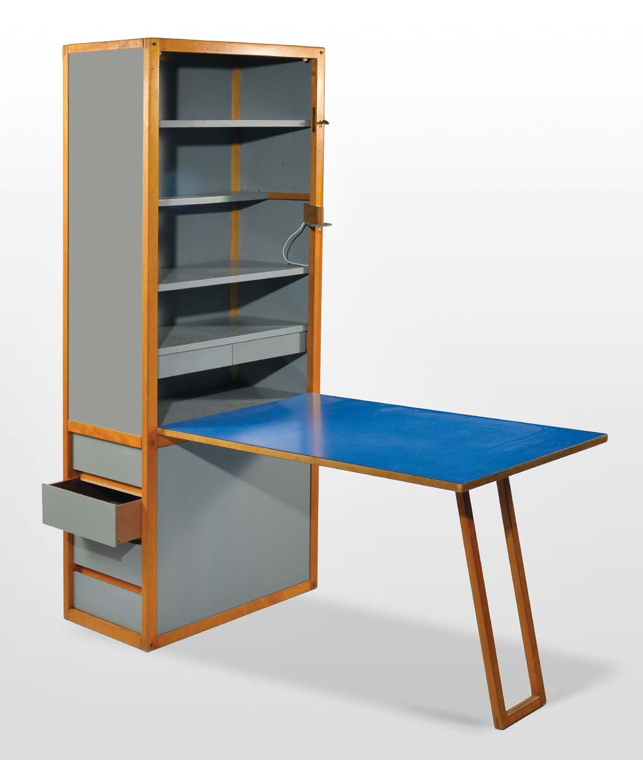 Secrétaire bibliothèque, bois naturel, thermolaqué bleu et gris, 190 x 78 x 44 cm. Ce meuble appartient à l’ensemble du mobilier réalisé pour la cité universitaire de Lyon dans les années 50 3000/5000