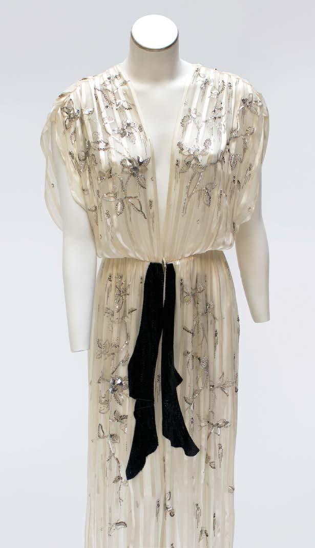 20. Christian Dior, haute couture, printemps-été 1979, no 011612 Déshabillé en soie crème rayée brodée de fleurs en fil d’or, sequins et perlettes noirs et argentés 200/300