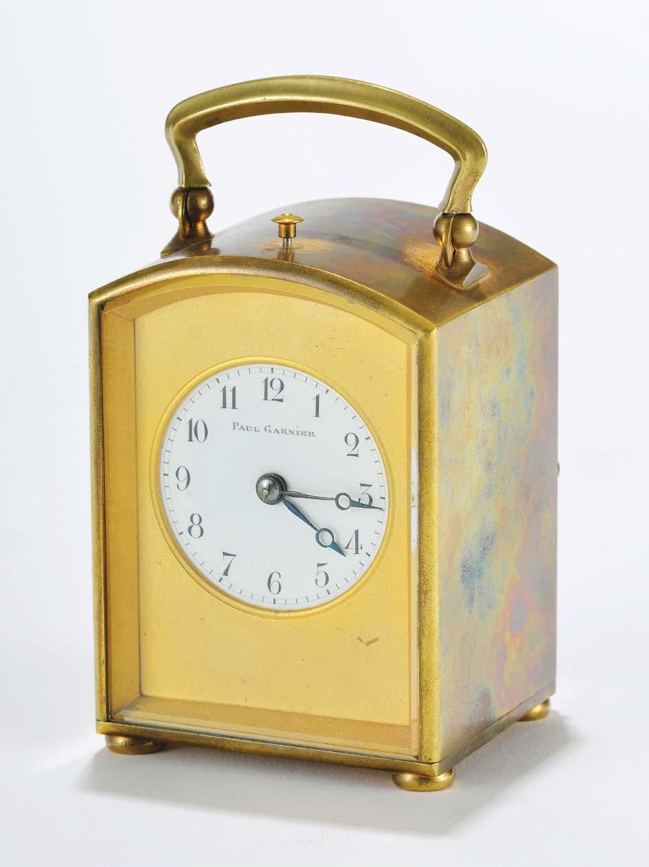 33. Paul Garnier, pendulette, XIXe s Laiton doré et émail blanc, cadran aux chiffres romains, H 11.5 cm 200/300