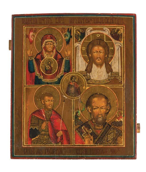 41. La Vierge à l’Enfant, le Christ, Sainte-Anne et Saint-Nicolas Icône russe quadripartite sur panneau et sous verre, 42 x 36 cm 1000/1500