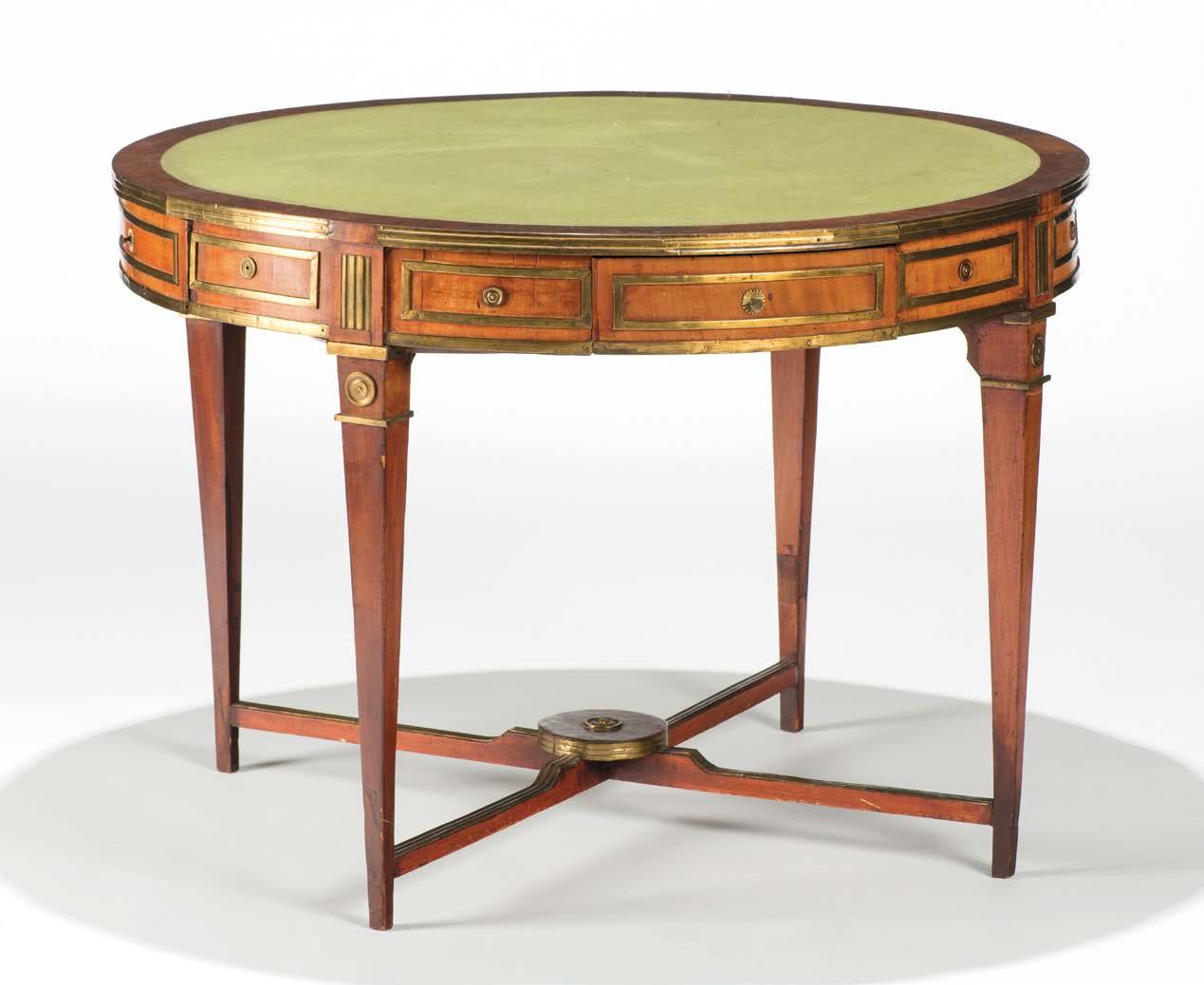 Quatre tiroirs et entretoise en X, acajou et larges moulures de laiton, feutre vert, 72 x 103 cm 1000/1500