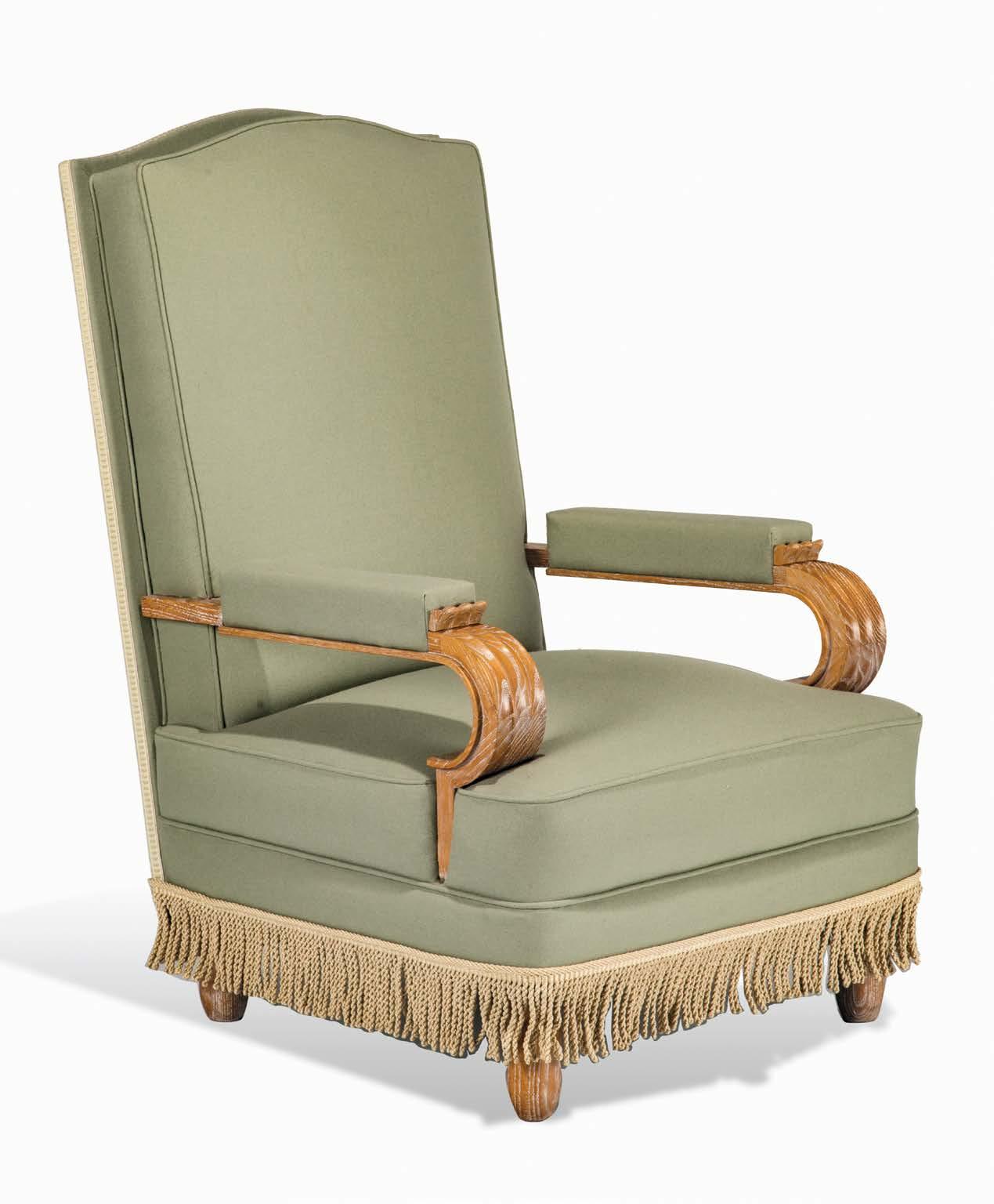 Fauteuil trône, chêne cérusé, drap de laine, circa 1940, 112 x 74 x 84 cm. Bibliographie : In Yvonne Brunnhammer, André Arbus, ill. p. 150, intérieur de Madame Peterson, 1938. 3000/5000