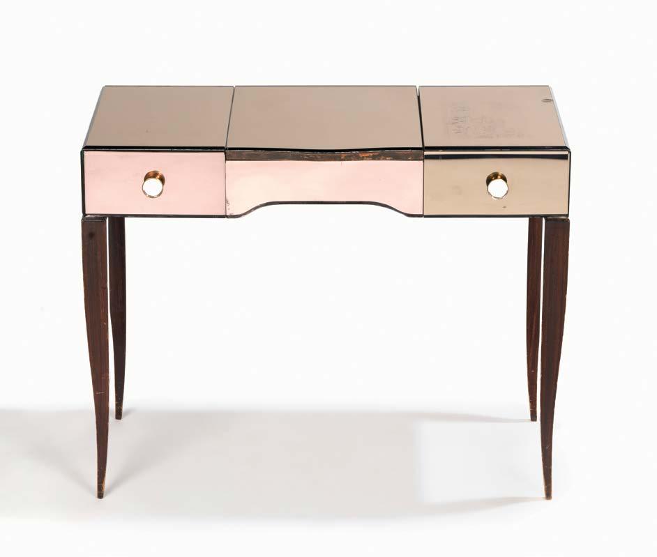 900. Coiffeuse d’époque Art déco Deux tiroirs, un abattant, piètement légèrement galbé, verre fumé biseauté, 72 x 90 x 41 cm 300/500