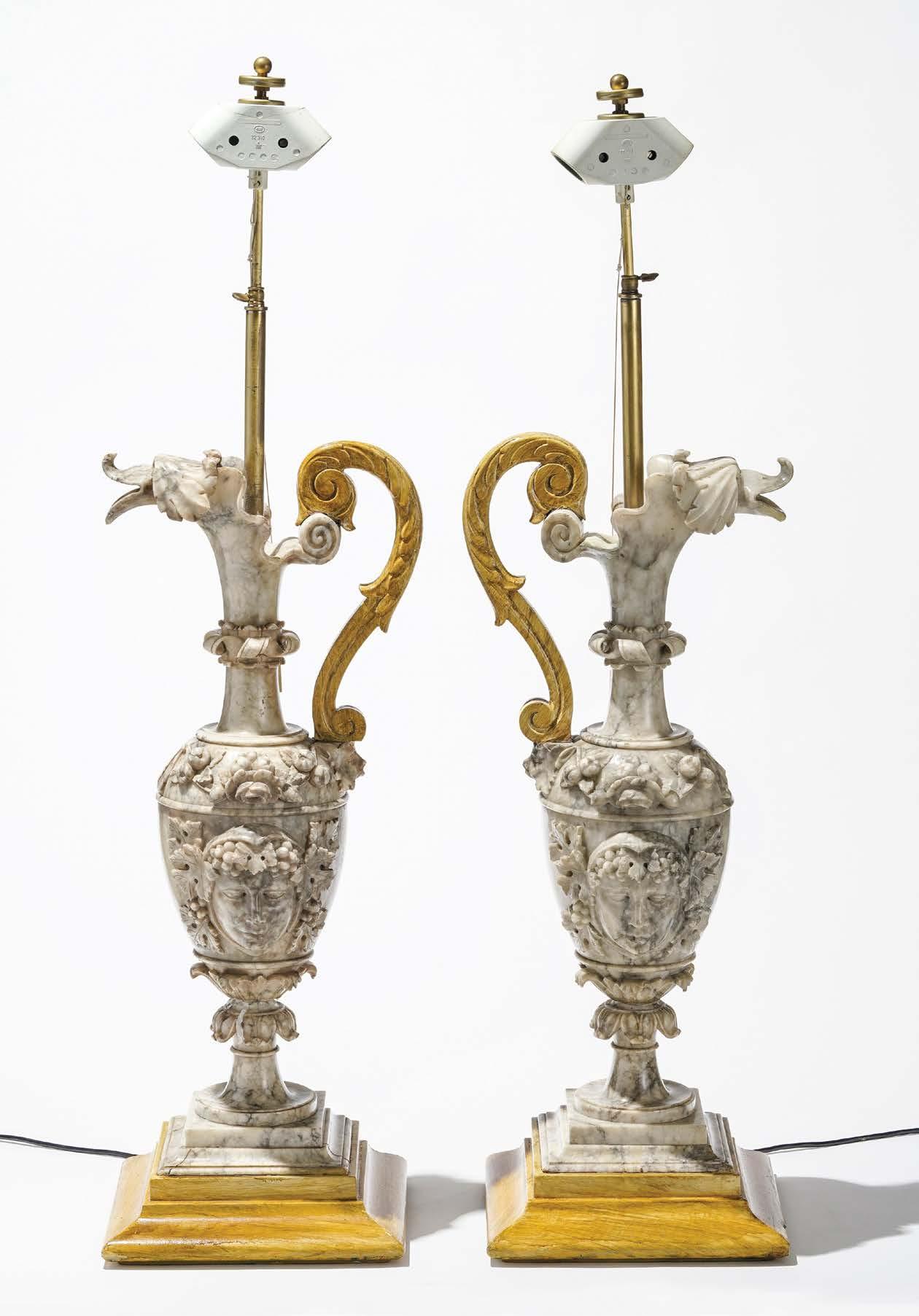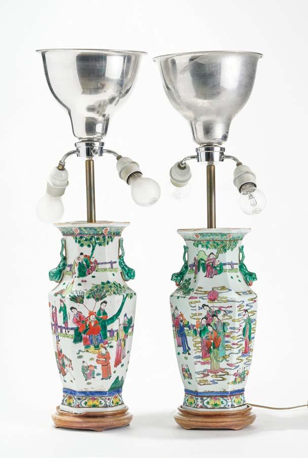 891. Paire de lampes balustre dans le style chinois Pieds en laiton, céramique émaillée blanc, H 79 cm 400/600