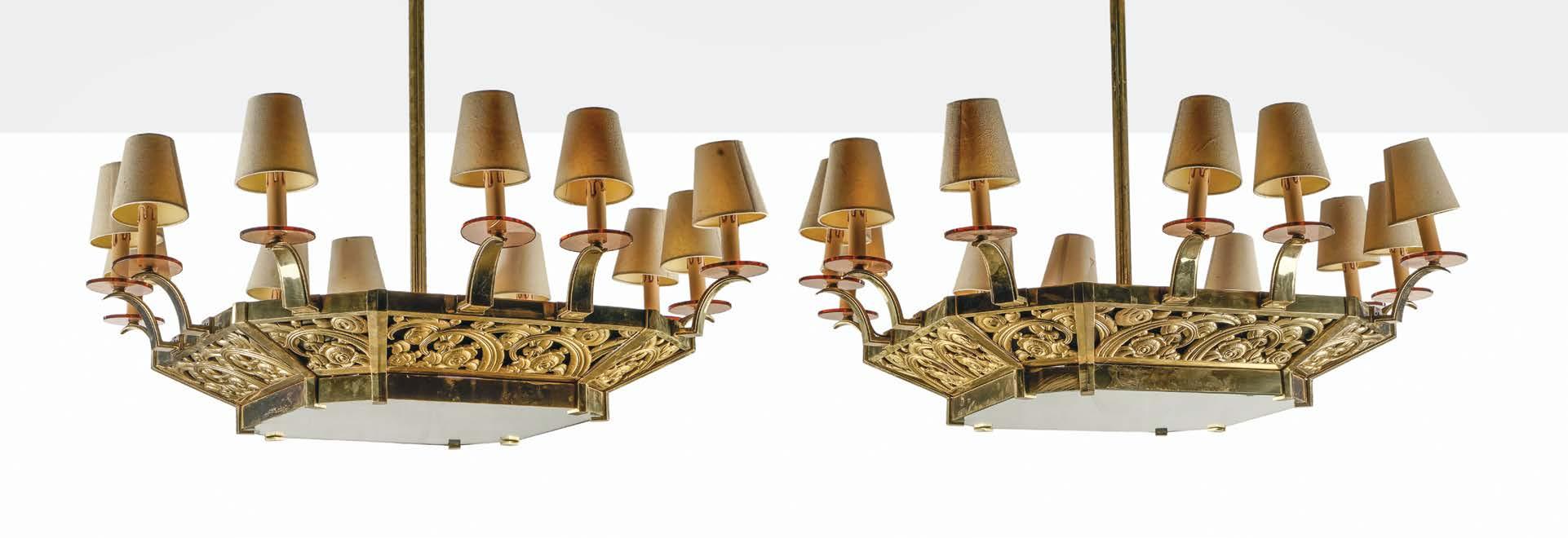 Vasques octogonales à fond de miroir supportant 12 bras de lumière, laiton doré ajouré à motif floral, 95 x 100 x 100 cm. Provenance : Grand hôtel genevois. 3000/5000