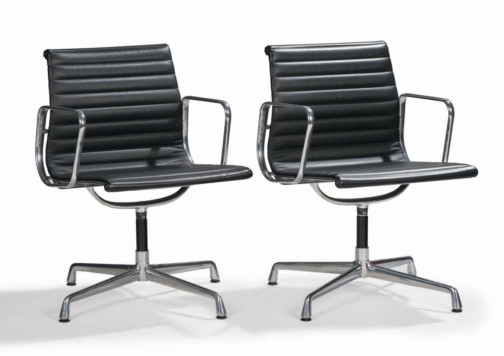 Paire de fauteuils Aluminium Group, piètement télescopique, aluminium chromé et cuir noir, édition ICF, circa 1960 1000/1500