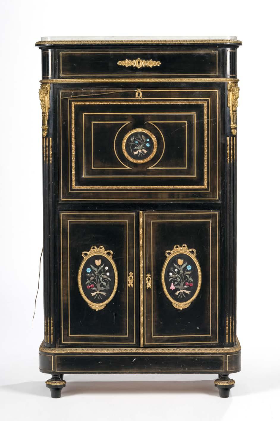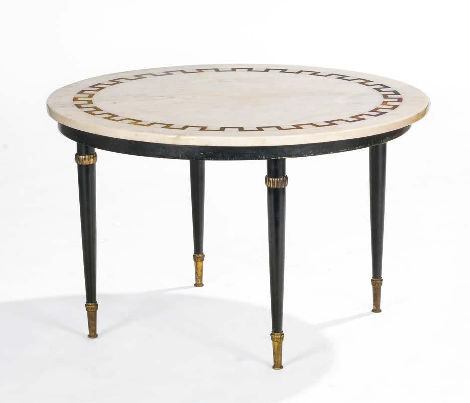 Piètement en métal laqué noir, plateau en marbre et incrustations de laiton, H 49, D 79 cm 400/600