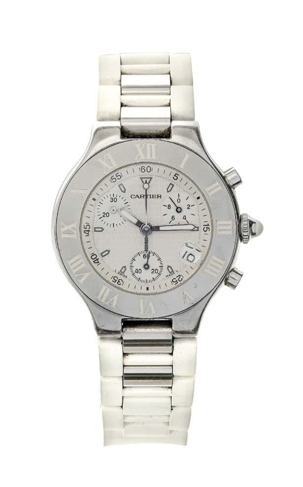 38. Cartier, Chronoscaph 21, montre chronographe à quartz ronde Cadran blanc à trois compteurs, chiffres romains blancs sur la lunette, index et aiguilles argentés luminescents, date à guichet à 4 h, bracelet blanc à boucle déployante, acier inoxydable, D 38 mm 600/800