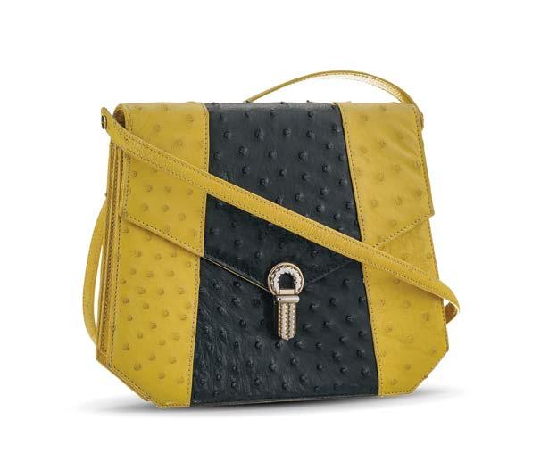 Autruche noir et jaune, bandoulière, fermoir en laiton doré et argenté, 20 x 24 cm 300/500