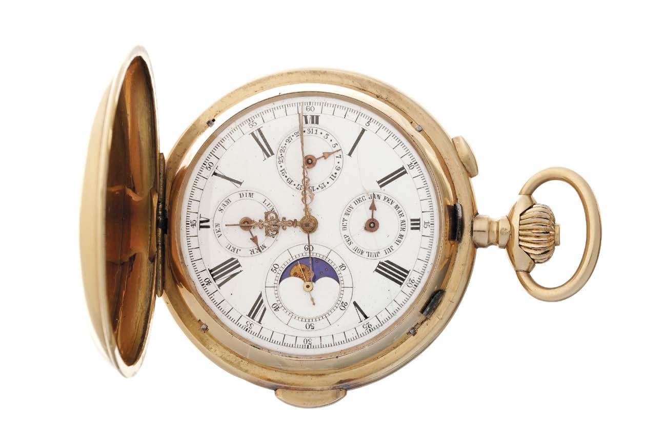 Cadran blanc émaillé comportant quatre cadrans, cadran dateur à midi, cadran du mois à 3 h, secondes avec ouverture pour les phases de la lune à 6 h et cadran du jour de la semaine à 9 h, chiffres noirs, aiguilles dorées, trotteuse, or 750, D 58 mm, poids brut 157 g, numérotée 312424, diplôme d’honneur Paris 1896, boîtier monogrammé AR 2000/3000