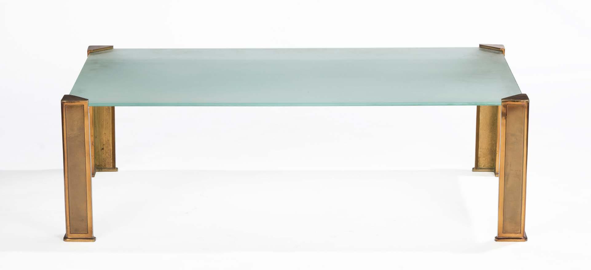 Table basse, plateau en verre dépoli, pieds en bronze doré, 41 x 131 x 80 cm 300/500