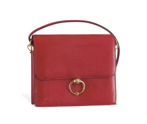 10. William Gurtner, sac à rabat Autruche rouge, bandoulière, fermoir en laiton doré, 20 x 22 cm 300/500