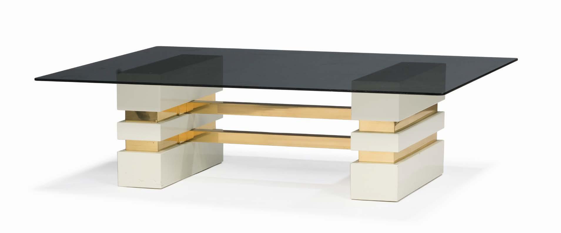 Métal laqué blanc et doré, verre fumé, édition Tarzia, 39 x 60 x 60 cm et 40 x 140 x 90 cm 200/300