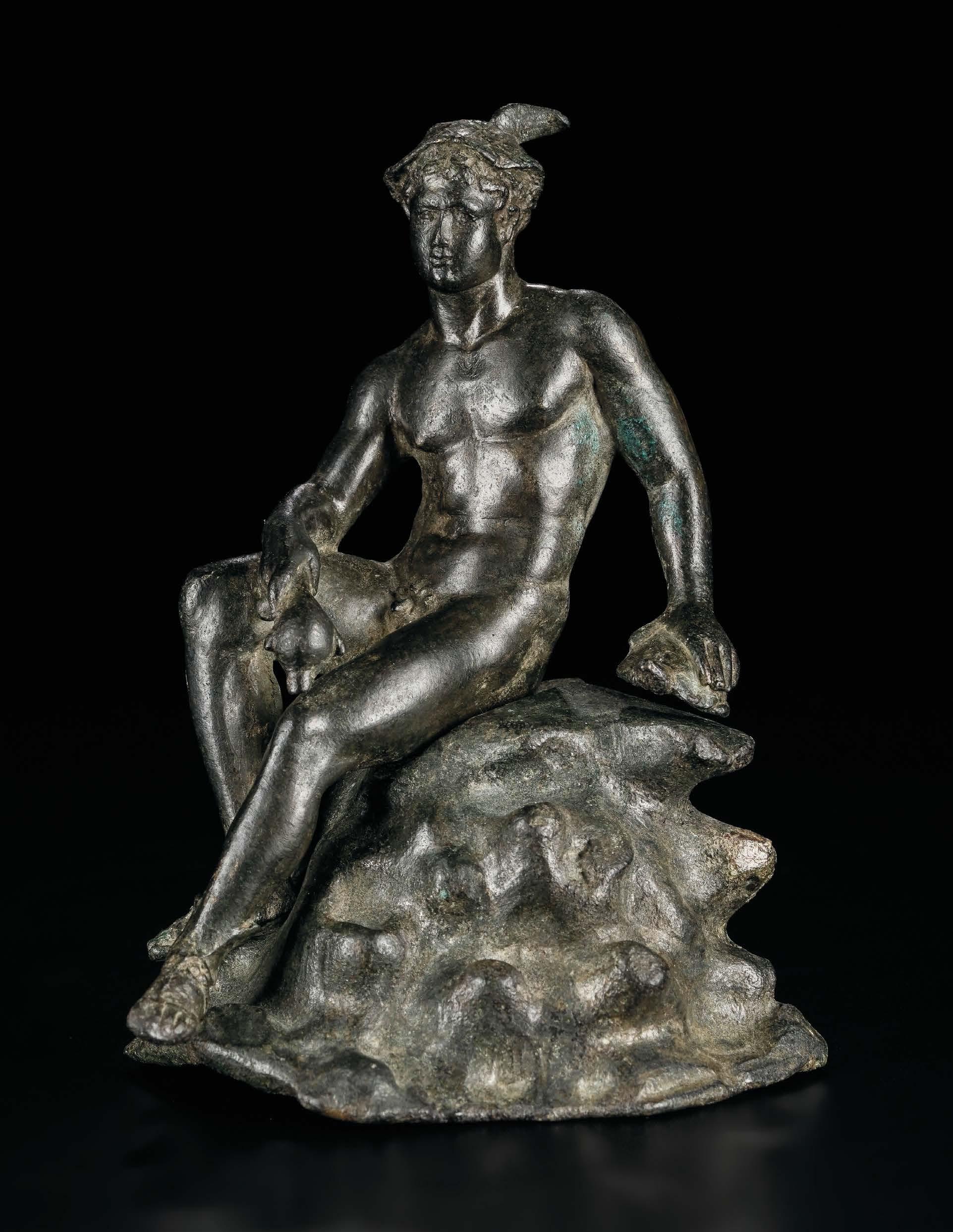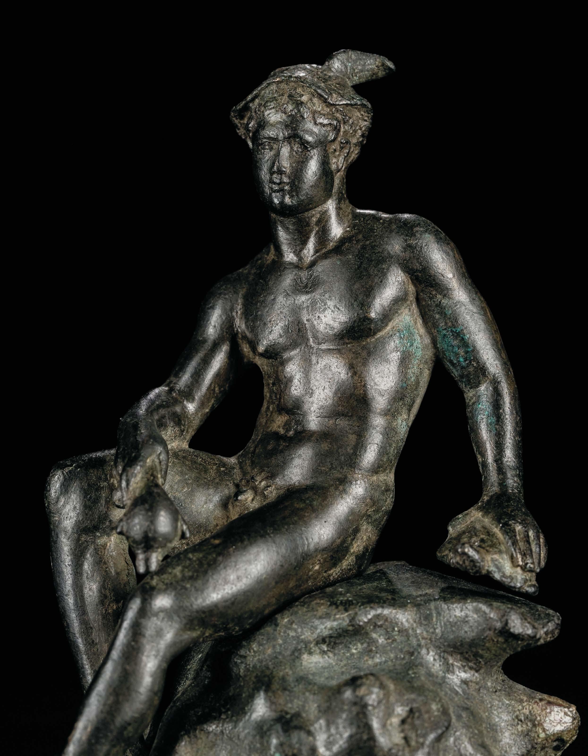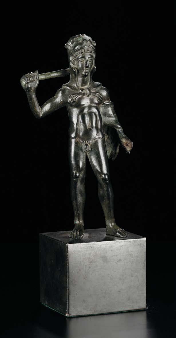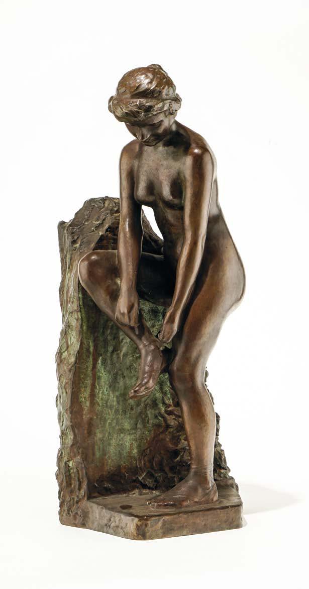 Jeune femme attachant sa sandale, bronze à patine brune, signé, H 65 cm 300/500