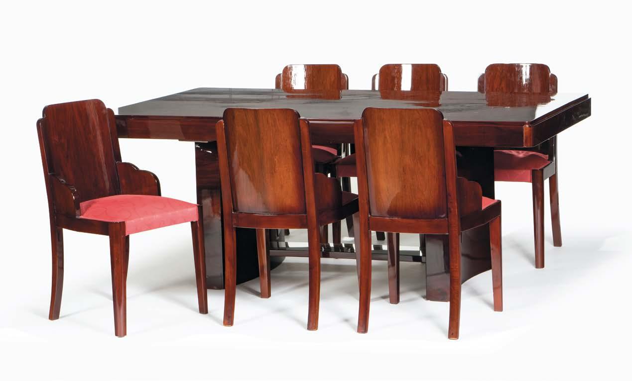 1182. Table de salle à manger et six chaises d’époque Art Déco dans le goût de Majorelle