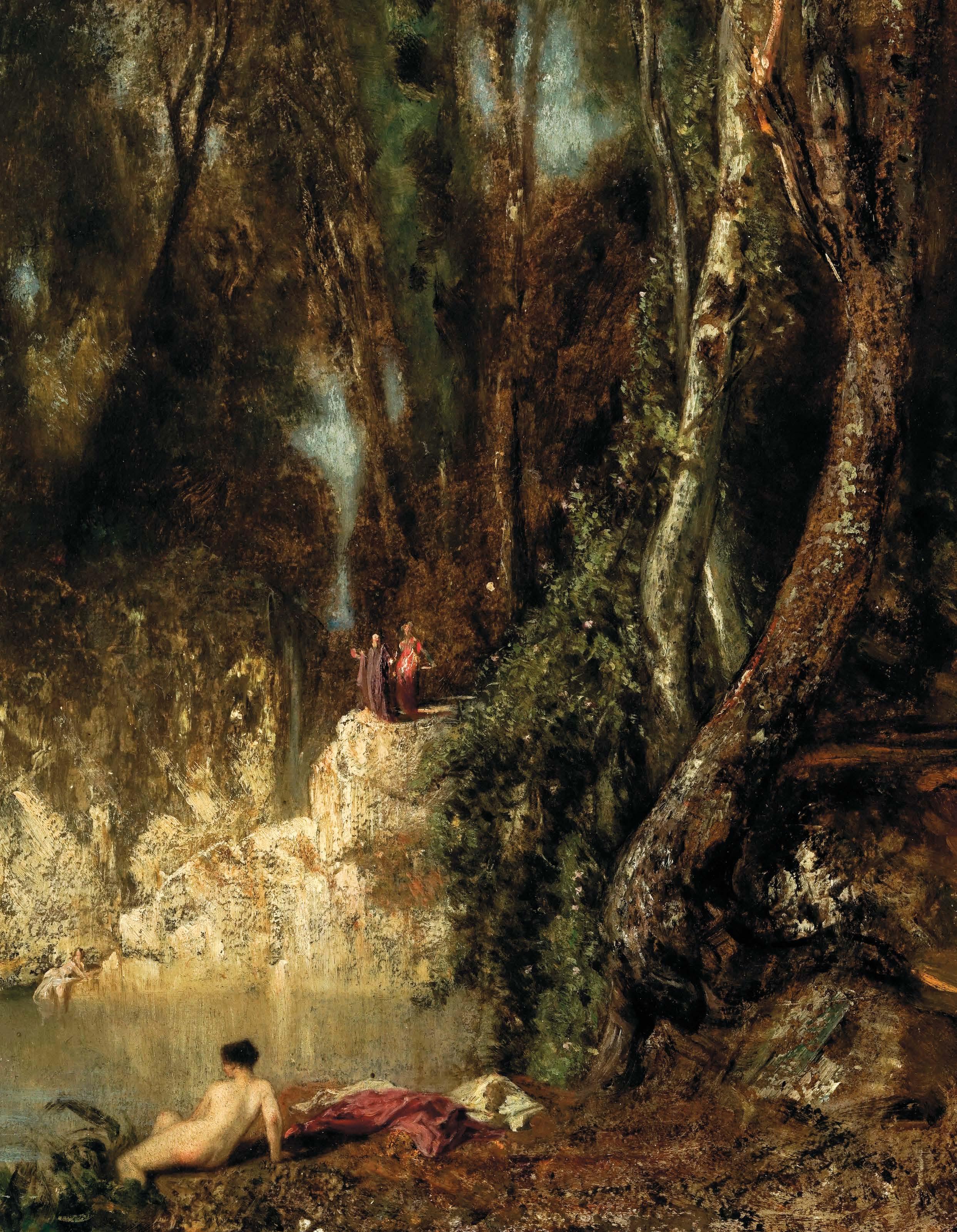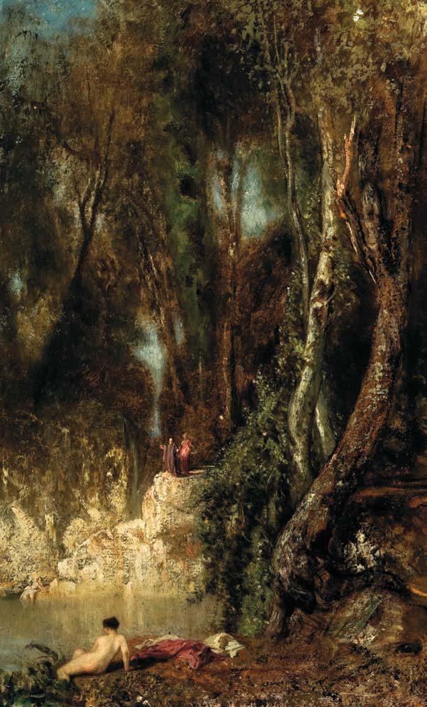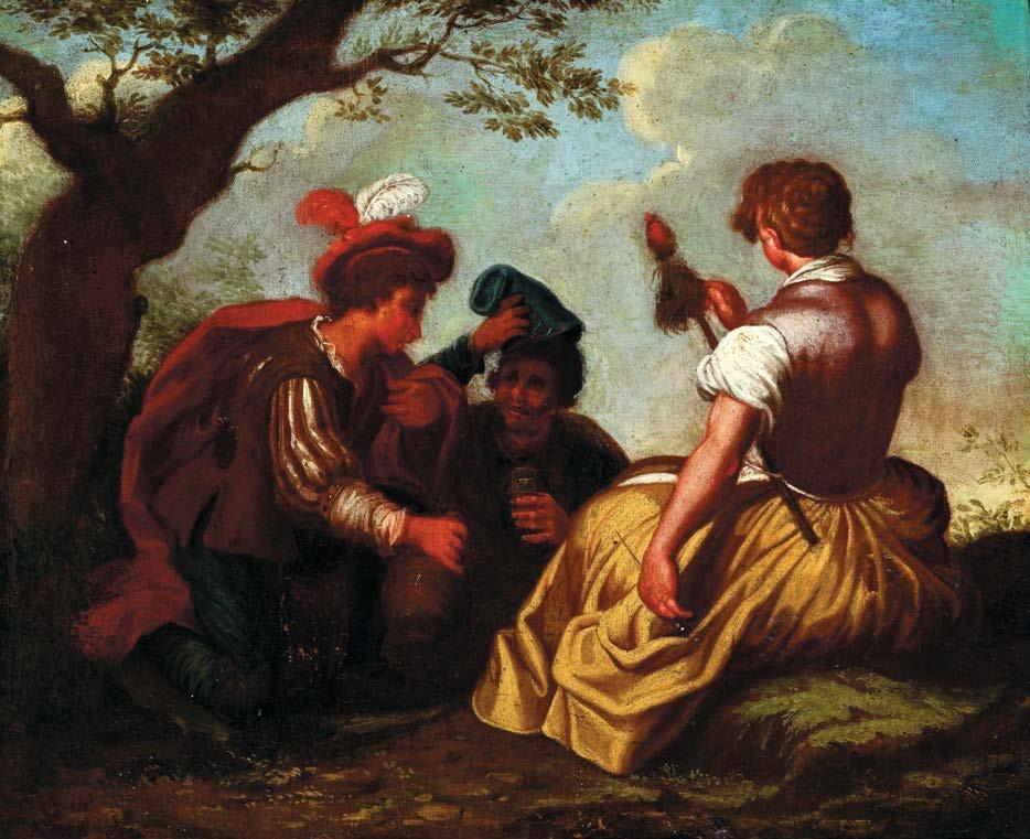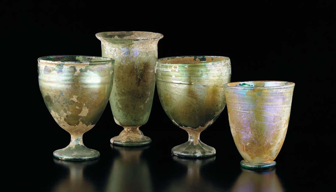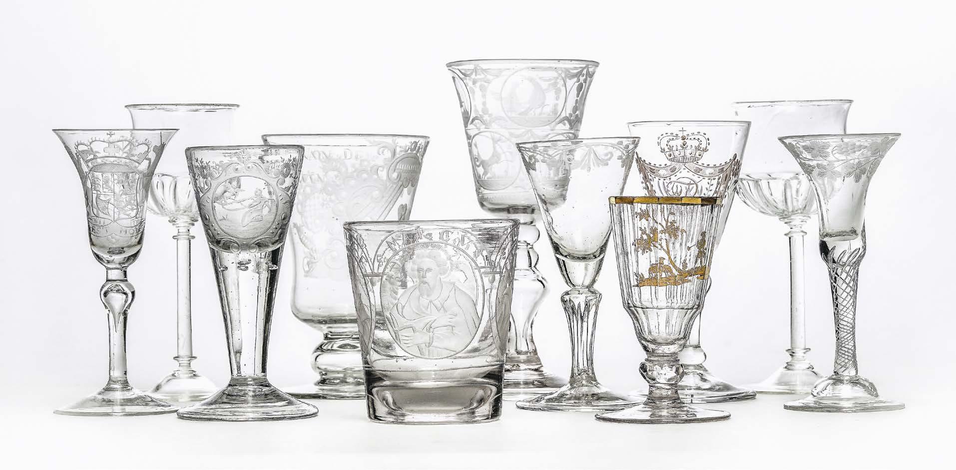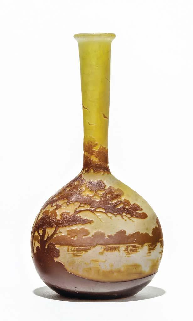 Verre à décor de paysage lacustre et élégantes, H 8 cm 300/500