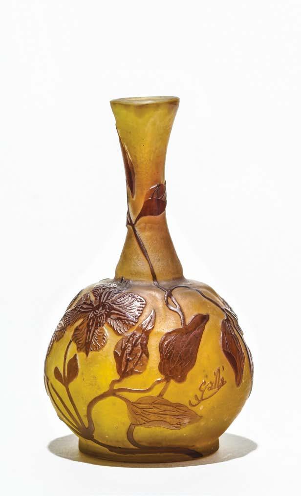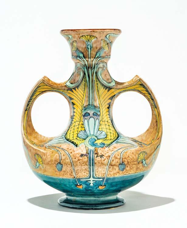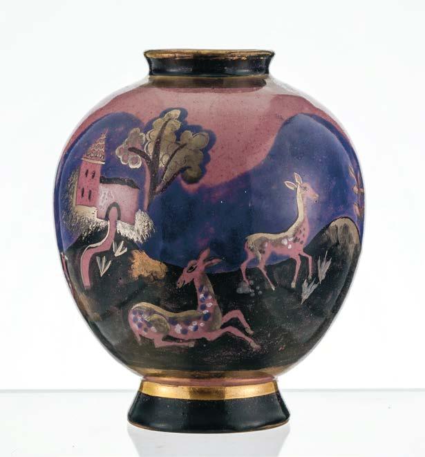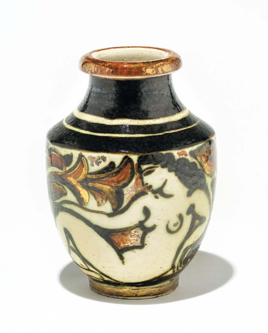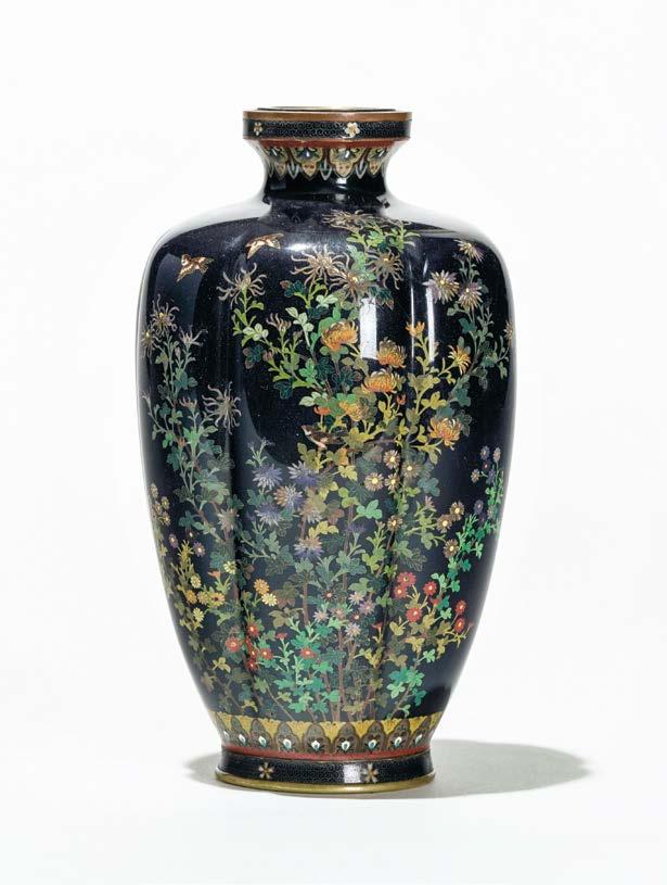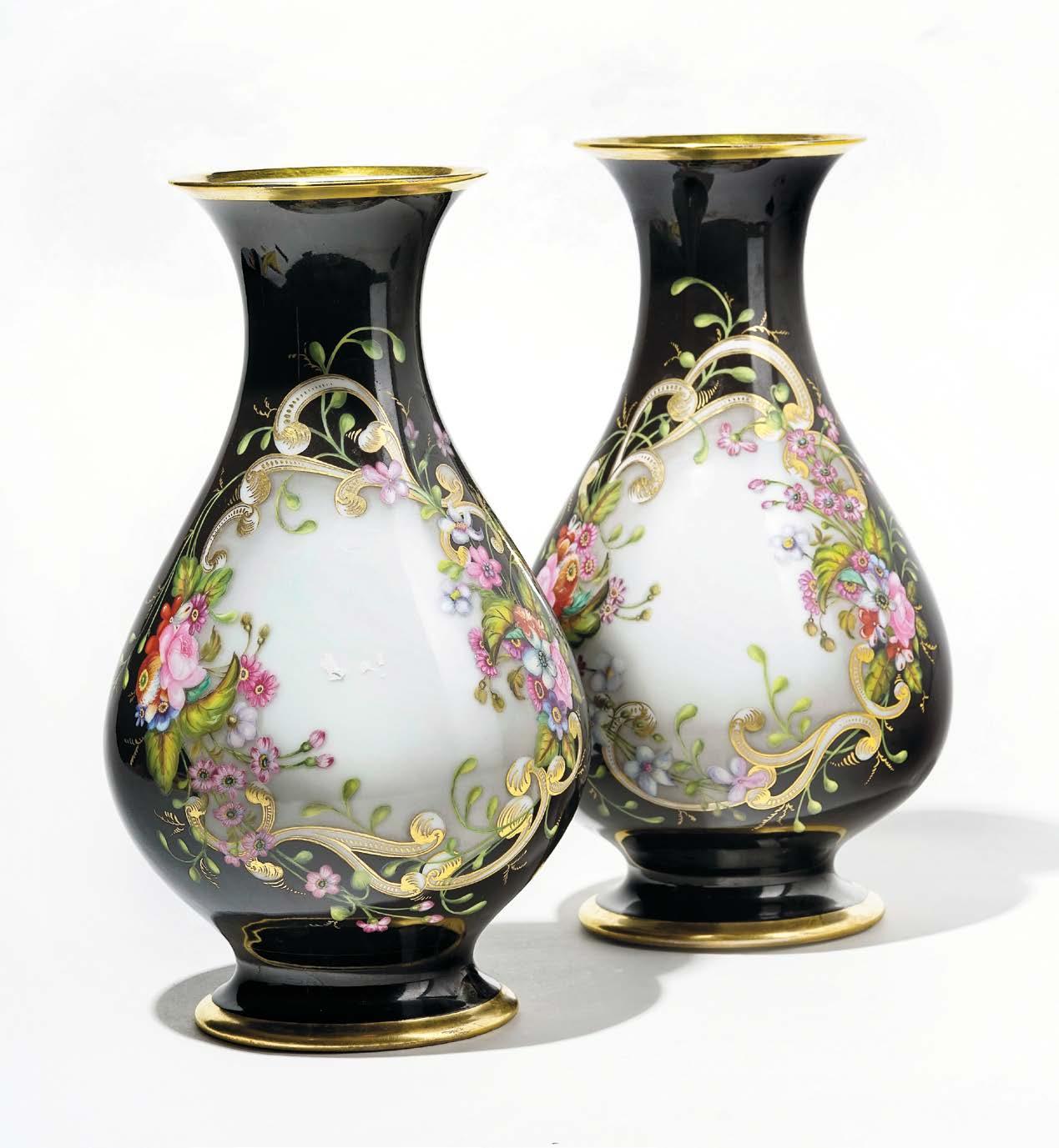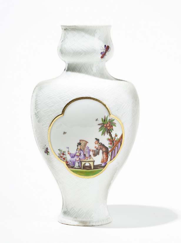 Porcelaine et émaux polychromes à décor de vases, anse gainée d’osier, H 21 cm 400/600