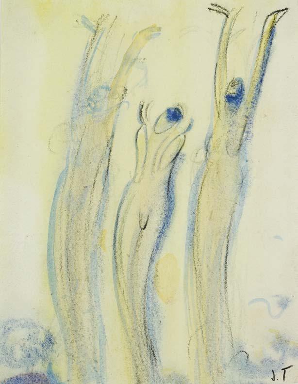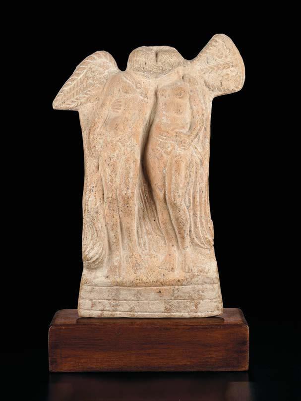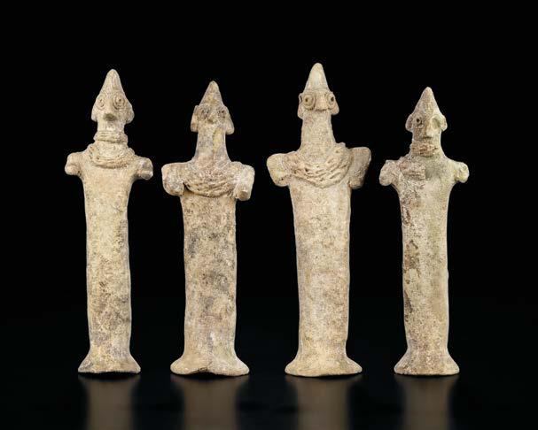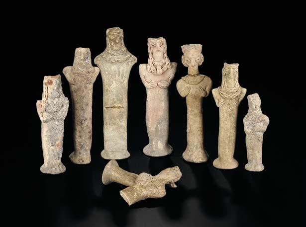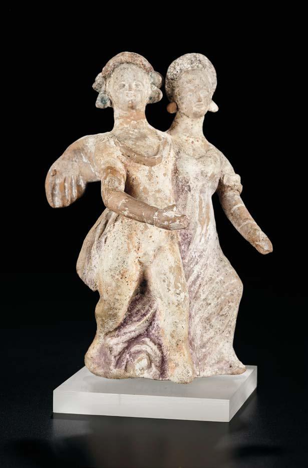 33. Trois servantes, Chine, dynastie Ming (1368-1644) ou antérieur Terre crue et fibres naturelles, ancienne polychromie, H 32 et 34 cm 800/1200