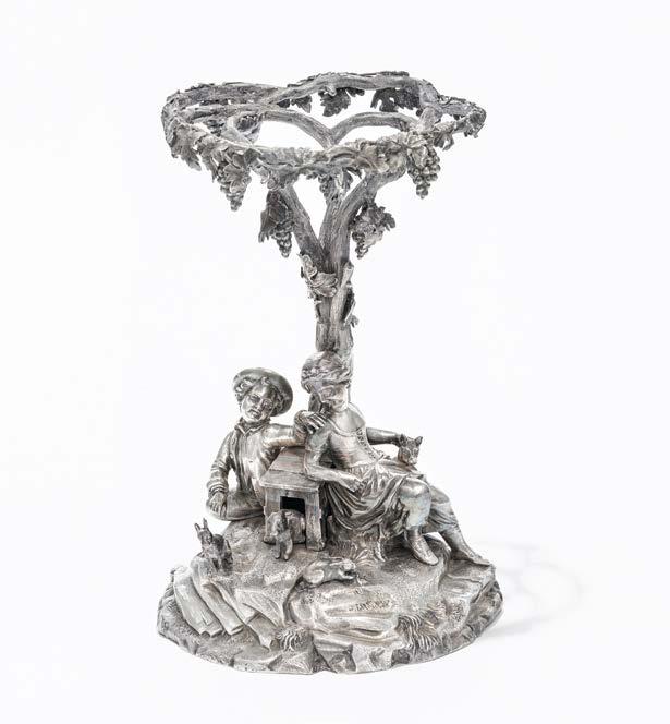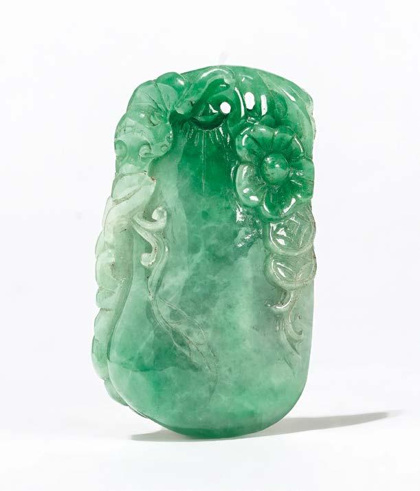 40. Corail sculpté à décor d’un paon et de volatiles Monture argent, H 23 cm, poids brut 935 g 2000/3000