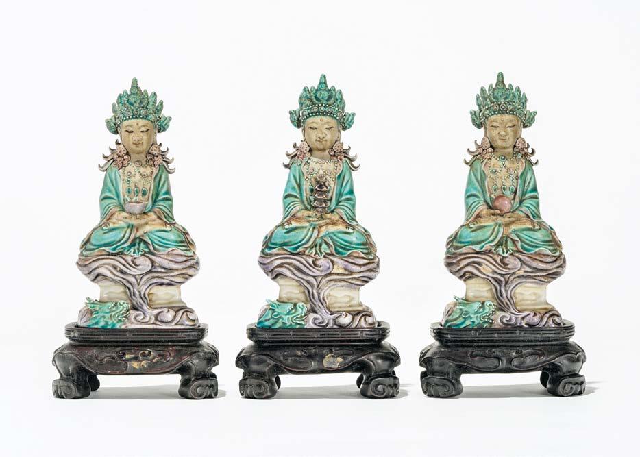 28. Suite de trois guanyin assises, Chine, dynastie Qing (1644-1912) Porcelaine émaillée violet et turquoise, socle en bois noirci, H 15 cm 300/500