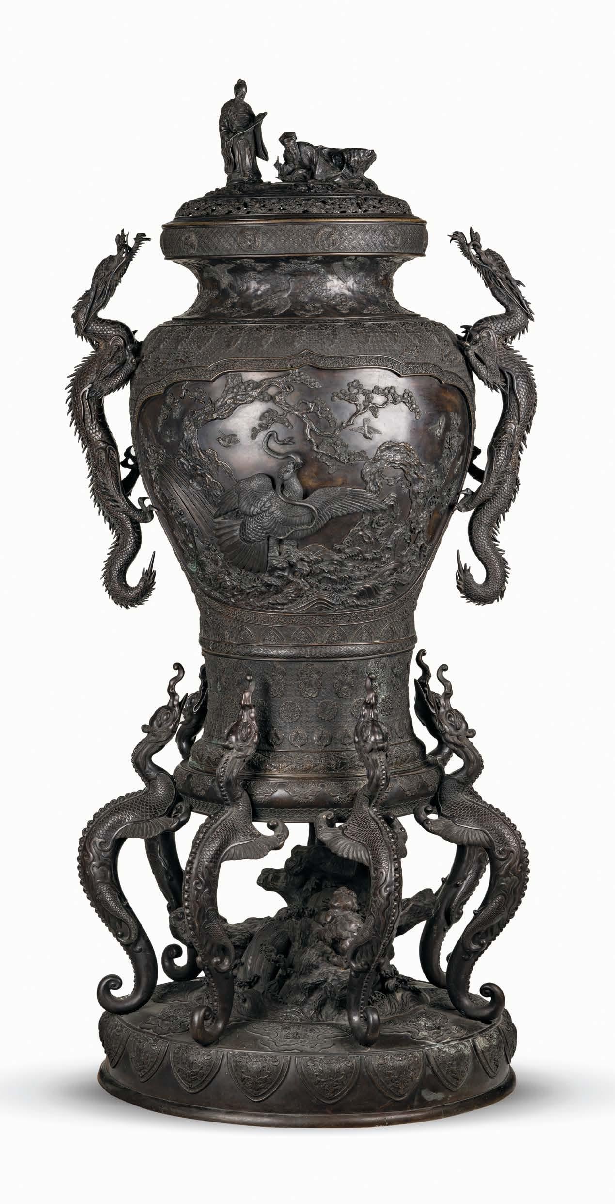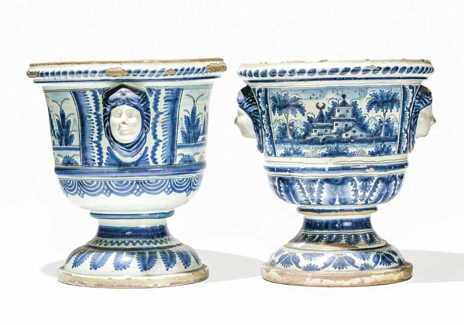 14. Grand cache-pot avec soucoupe, Chine, XXe s Porcelaine à décor de personnages et calligraphie, cache-pot : H 44 cm, D 4 cm ; soucoupe : H 7 cm, D 46 cm 300/500
